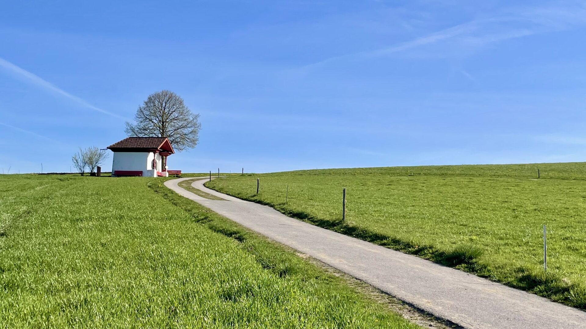 Beim Weiher Bromen verlässt man den Wald – und wird fortan bis zum Ziel vom Alpenpanorama begleitet. Der Weg führt erneut durch landwirtschaftlich geprägte Gebiete, während in der Ferne bereits die malerische Kapelle bei Gormund ins Auge fällt. Ein besonderer Abschnitt folgt mit der Querung des gepflegten Golfplatzes – landschaftlich zwar reizvoll, aber ein spürbarer Kontrast. Kurz danach erreicht man die Schlachtkapelle und das Denkmal zur Erinnerung an die Schlacht bei Sempach sowie an den legendären Schweizerhelden Arnold Winkelried.
