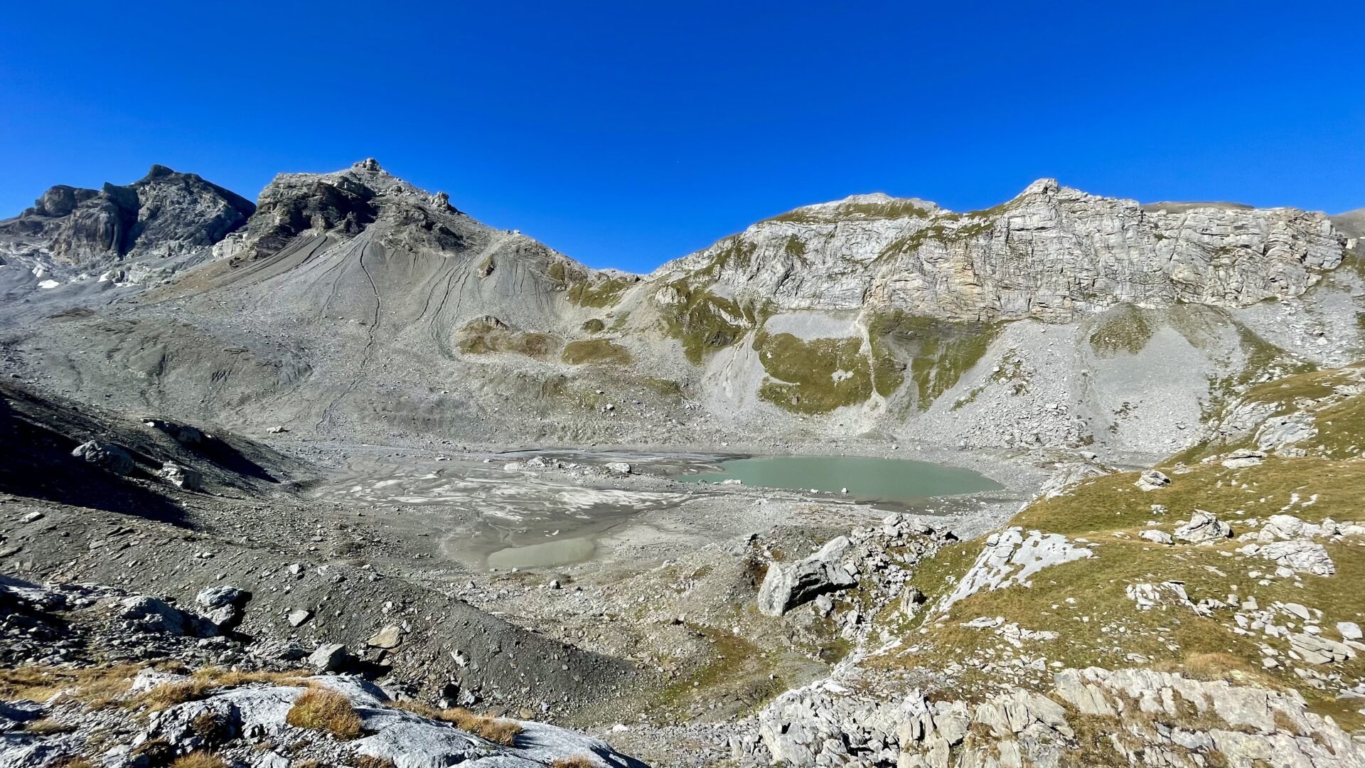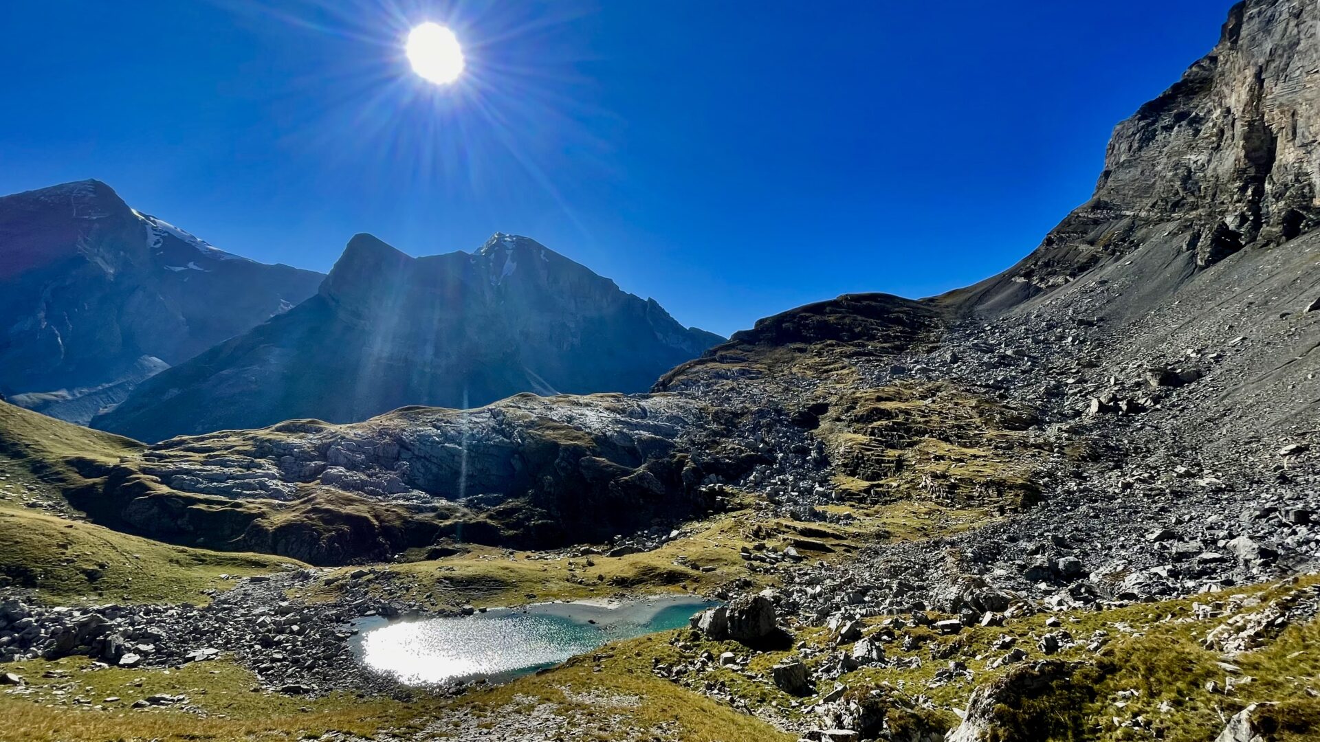 Mit dem Passwechsel ändert sich die Kulisse abrupt: Vor Dir breitet sich die riesige Engstligenalp aus. Am Rand ist bereits die Bergstation der Seilbahn «Unter dem Birg–Engstligenalp» sichtbar. Der Abstieg über die Märbene (3.6 km, fast 700 Hm) ist steil, aber technisch leicht. Unterwegs lockt ein kleiner namenloser Bergsee zu einer Rast.