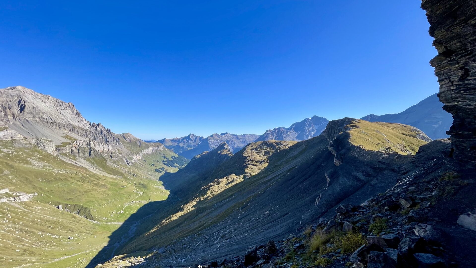 Deutlich steiler wird es bis zum Schwarzgrättli auf knapp 2’400 m ü. M. Über 300 Höhenmeter sind auf kurzer Distanz zu überwinden. Die Mühe lohnt sich: Mit jedem Schritt öffnen sich grandiosere Ausblicke. Kurz vor dem Ziel erscheint der Daubensee in der Tiefe, dahinter der Gemmipass mit der Seilbahn nach Leukerbad.