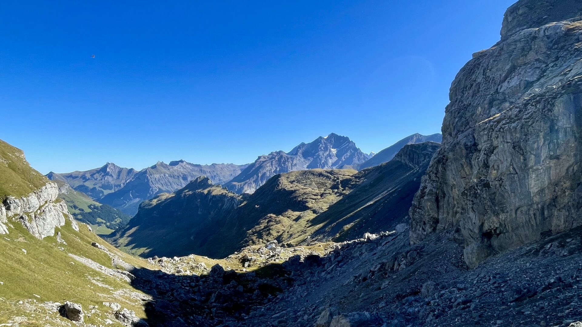 In weitem Bogen zieht der Weg bergan zum Chindbettipass. Steil ist es nicht, aber stellenweise ausgesetzt – diesmal ohne Ketten. Mit Umsicht gut machbar. Dafür belohnen spektakuläre Ausblicke: ins Kandertal, auf die Gipfel rund um Kandersteg und zu Füssen auf das Tälliseewli.