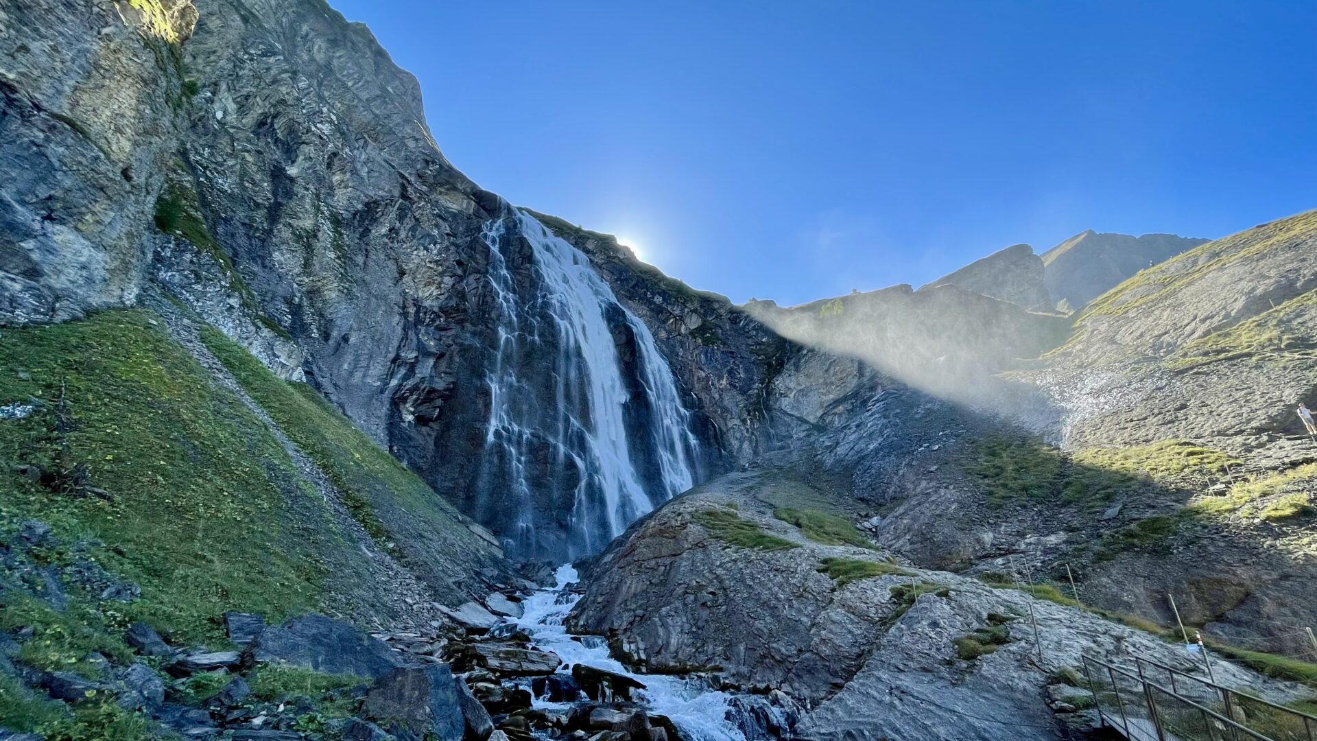 Noch anspruchsvoller für die Knie ist der letzte Abschnitt: 3 km und über 550 Hm fast ausschliesslich auf Stufen – und die sind selten gleich hoch. Landschaftlich aber ein Highlight: Der Weg schlängelt sich an steilen Felswänden vorbei und eröffnet den Blick auf mehrere Wasserfälle in voller Wucht. Wer sich diesen Abstieg ersparen möchte, nimmt die Seilbahn und spart gut eine Stunde.