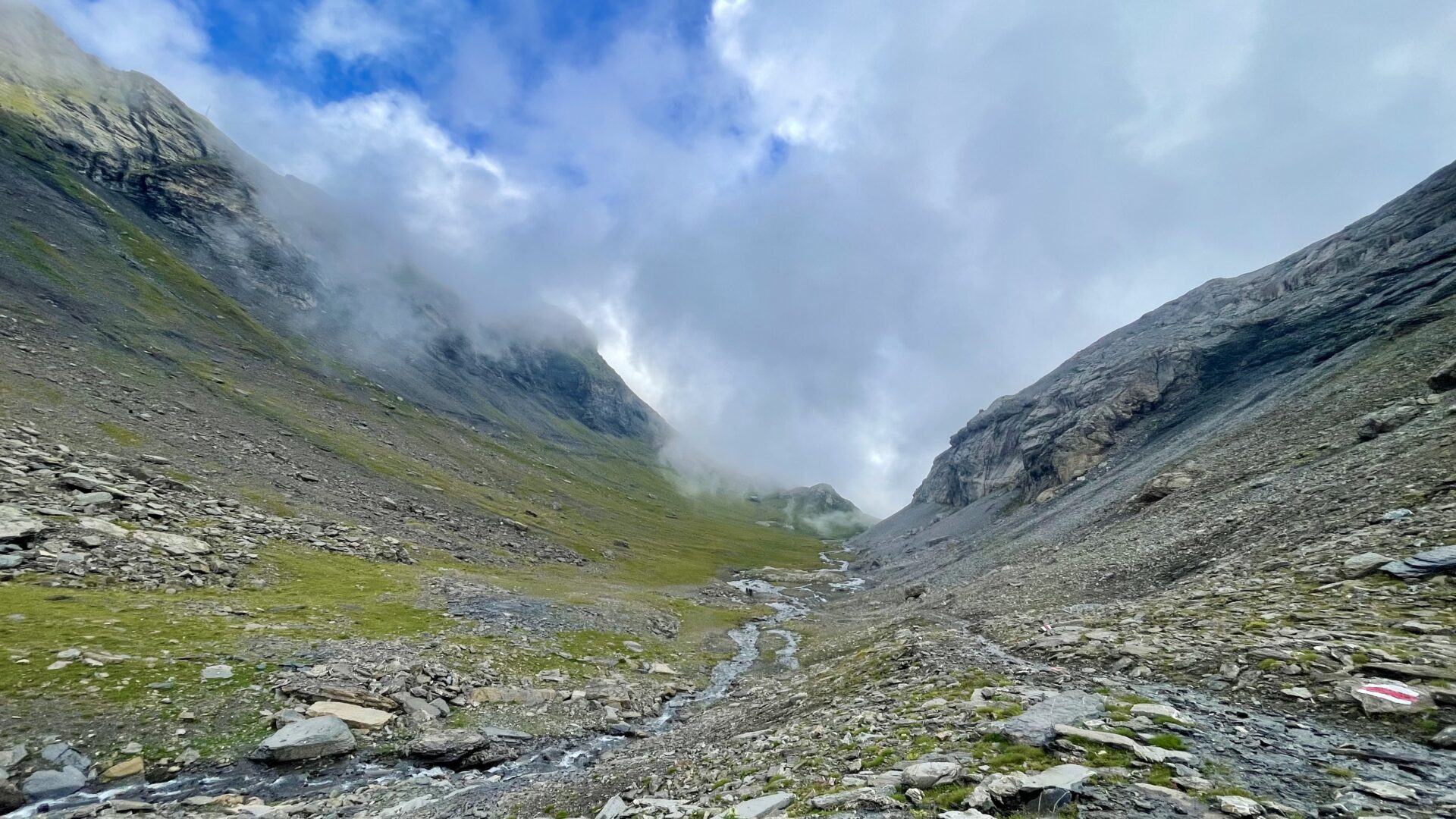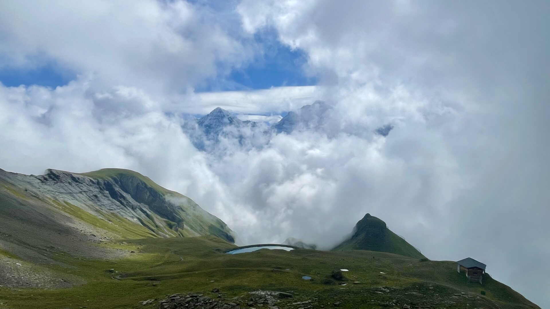 Von der Schilthornhütte führt der Weg über die Bietenlücke – und verlangt deutlich mehr (Schwierigkeitsgrad T4). Der Aufstieg wie auch der Abstieg sind fordernd. Der Pfad ist oft schmal, ausgesetzt und rutschig; neben dem Weg fällt der Hang steil ab. Handketten geben Sicherheit, dennoch sind höchste Konzentration und Trittsicherheit gefragt. Bei nassem Wetter ist die Route nicht empfehlenswert, für Kinder ungeeignet. Wer die Bietenlücke erreicht, wird mit fantastischen Aussichten belohnt: auf der einen Seite das Dreigestirn Eiger, Mönch und Jungfrau, auf der anderen das weite Soustal, flankiert von Schilthorn, Drätt- und Hoganthore bis hin zu Schwalmere und Lobhoren. Während unserer Tour verhüllte Nebel das Dreigestirn – doch die Sicht ins Soustal war grandios und machte alles wett.