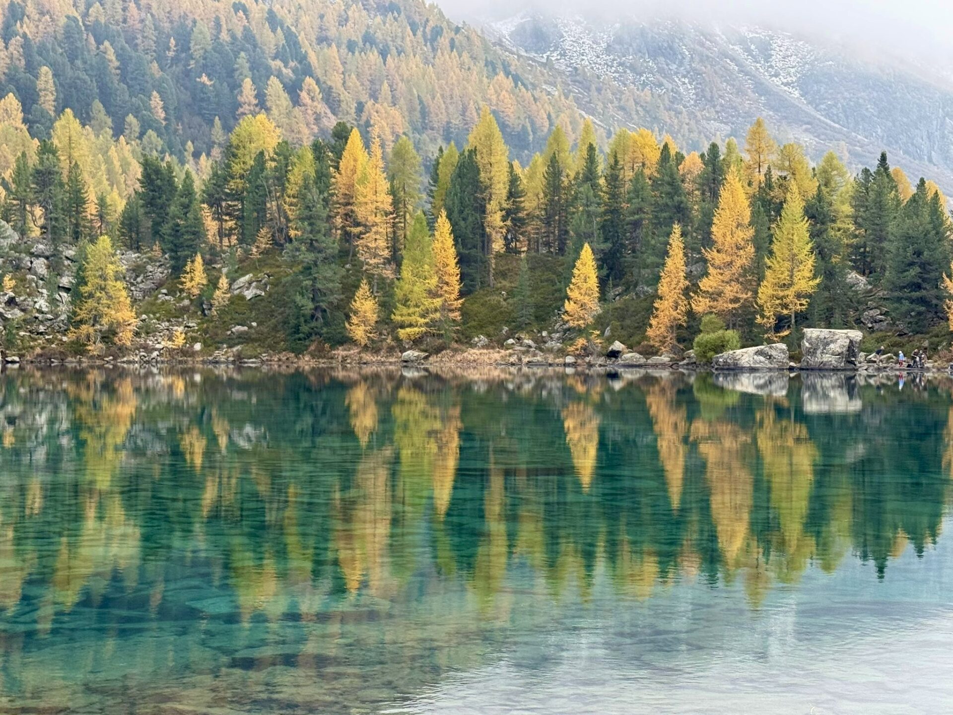 Der Hype um diesen See ist gerechtfertigt. Das Wasser schimmert türkis bis tiefblau, die Spiegelungen der Lärchen und Berge wirken fast surreal. Kaum jemand, der hier ankommt, möchte wieder gehen – man will einfach verweilen, staunen, still sein.