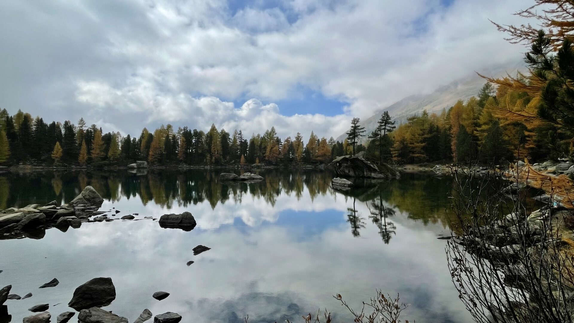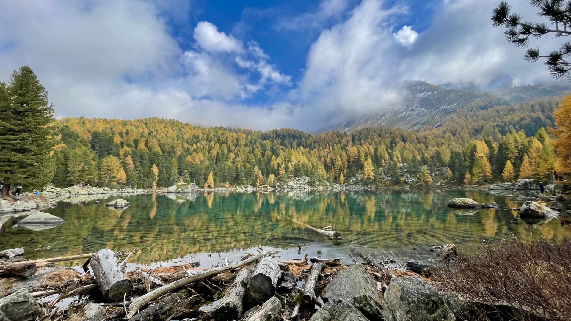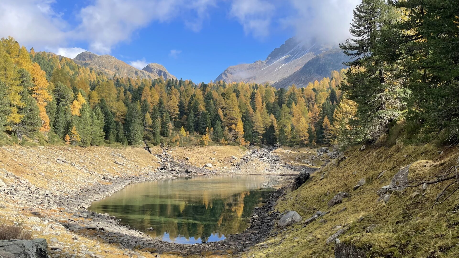 Diese Etappe ist ein Traum. Der Weg schlängelt sich durch einen lichten Lärchenwald, zuerst zum kleineren Lagh da Scispadus, dann weiter zum legendären Lagh da Saoseo.