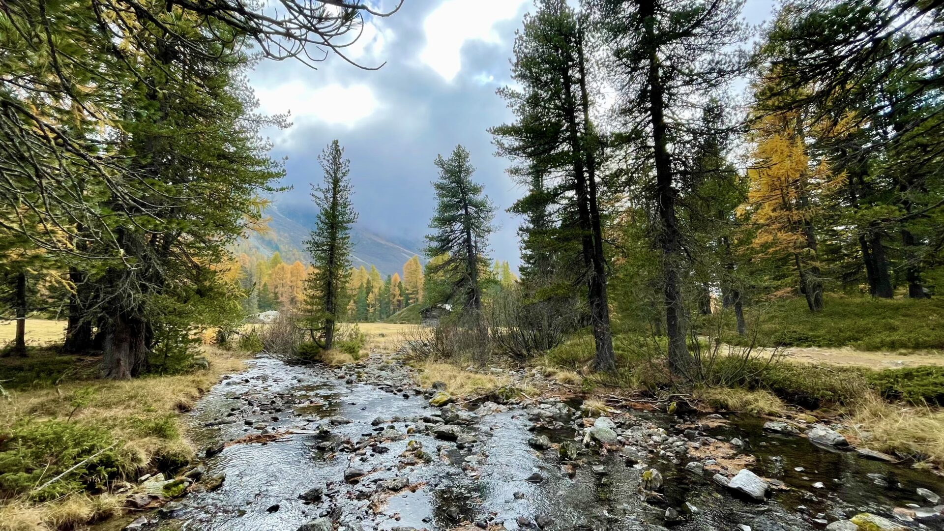 Der Rückweg verläuft – wie der Hinweg – durchs Val da Camp, wirkt aber völlig anders. Während der Aufstieg meist über Alpweiden führt, taucht man beim Abstieg in einen zauberhaften Lärchenwald ein. Zwischen den Bäumen glitzern kleine Bäche und Tümpel, das Licht tanzt auf dem Wasser – Idylle pur.